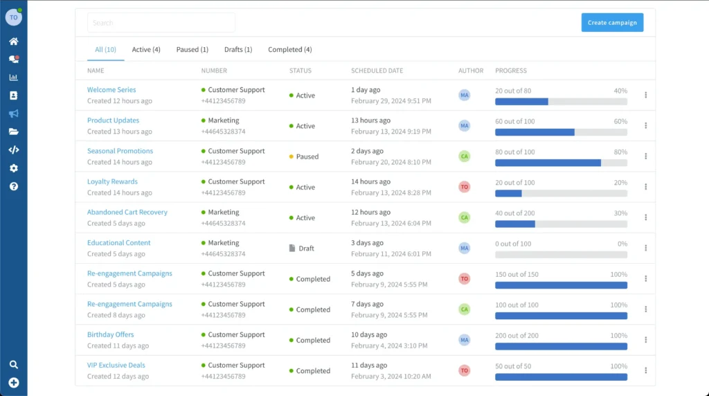 - Controla el resultado: Programe el envío en una fecha y hora específica, envíe mensajes de campaña a cualquier usuario de WhatsApp. Pausa, reanuda o cancela cuando quieras.