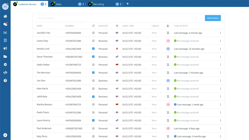 Sincroniza automáticamente todos los contactos de WhatsApp y tu agenda. Crea, edita, amplía información e importa contactos fácilmente en un sistema CRM totalmente integrado para todos tus clientes en WhatsApp.